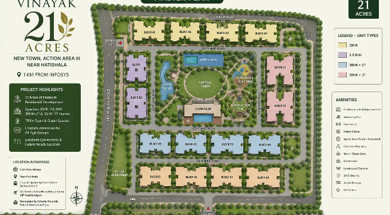 Vinayak 21 Acres Newtown is a premium residential township in Kolkata, spread across 21 acres of thoughtfully planned land. Offering 2 & 3 BHK high-rise apartments and luxury villas, the project seamlessly blends space, comfort, and modern living. Residents enjoy expansive green open spaces, world-class amenities, and multiple lifestyle clubhouses, creating a holistic community experience.